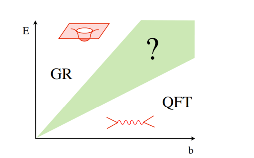 नीचे दिए गए चित्र में आइंस्टीन की जनरल रिलेटिविटी थ्योरी और क़्वांटम फील्ड थ्योरी की उपयुक्तता के क्षेत्र वर्णित किये गए है. x -अक्ष पर दो परस्पर प्रभावी इकाईओं के बीच न्यूनतम दूरी अंकित है जिसे b यानि की इम्पैक्ट पैरामीटर के नाम से जाना जाता है और y – अक्ष पर पिंडो की ऊर्जा अंकित है. जैसा की नीचे दिया गया चित्र बताता है कि एक ऐसा विस्तृत हरा क्षेत्र है जहां पर दोनों थ्योरी कोई निर्णायक समाधान नहीं दे पाती.